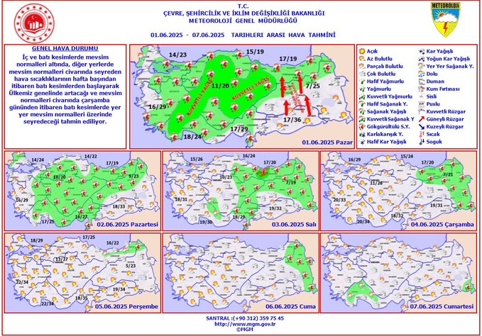“01.06.2025 Pazar günü gece birinci saatlerde Sivas’ın batısı, Kayseri’nin doğusu ve Tokat etraflarında, öğlen saatlerinde Kastamonu, Çankırı, Çorum ve Yozgat etraflarında lokal olarak kuvvetli sağanak ve gök gürültülü sağanak yağış bekleniyor. Ani sel, su baskını, yıldırım, lokal dolu yağışı, yağış anında kuvvetli rüzgar ve ulaşımda aksamalar üzere aksiliklere karşı dikkatli ve önlemli olunmalıdır.”
