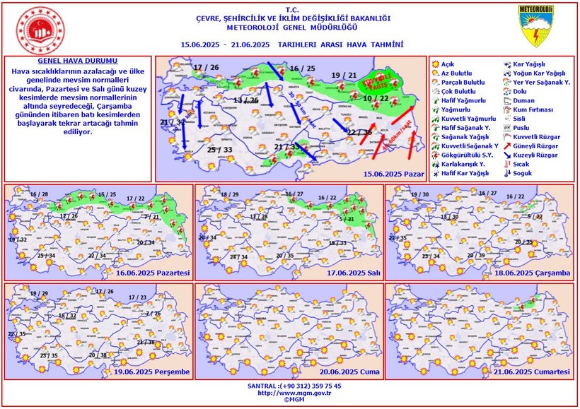 Pazartesi ve Salı günleri kuzey kısımlarda sıcaklıkların olağanların altına düşeceği, Çarşamba gününden itibaren ise batı bölgelerden başlayarak tekrar artışa geçeceği kestirim ediliyor.