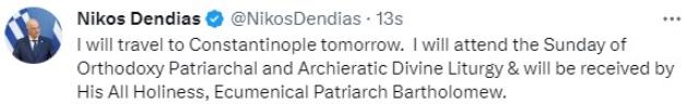 İstanbul ziyareti çerçevesinde Fener Rum Patriği Bartholomeos ile de bir ortaya gelecek olan Dendias, seyahat öncesinde toplumsal medyadan bir paylaşım yaptı. Dendias tweet’inde “Yarın Konstantinopolis’e seyahat edeceğim. Ortodoks Patriklik ve Archieratic Pazar gününe katılacağım ve Hazretleri Ekümenik Patrik Bartholomew tarafından karşılanacağım.” dedi.