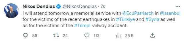 İstanbul yerine kullandığı söz reaksiyon çeken Dendias, kısa bir müddet sonra yeni bir paylaşım yaparak bu kere “İstanbul” sözüne yer verdi. Dendias yaptığı yeni paylaşımda ise şunları yazdı: “Yarın Türkiye ve Suriye’deki son zelzelelerin kurbanları ve Tempi demiryolu kazası kurbanları için İstanbul’da, @EcuPatriarch anma merasimine katılacağım.”